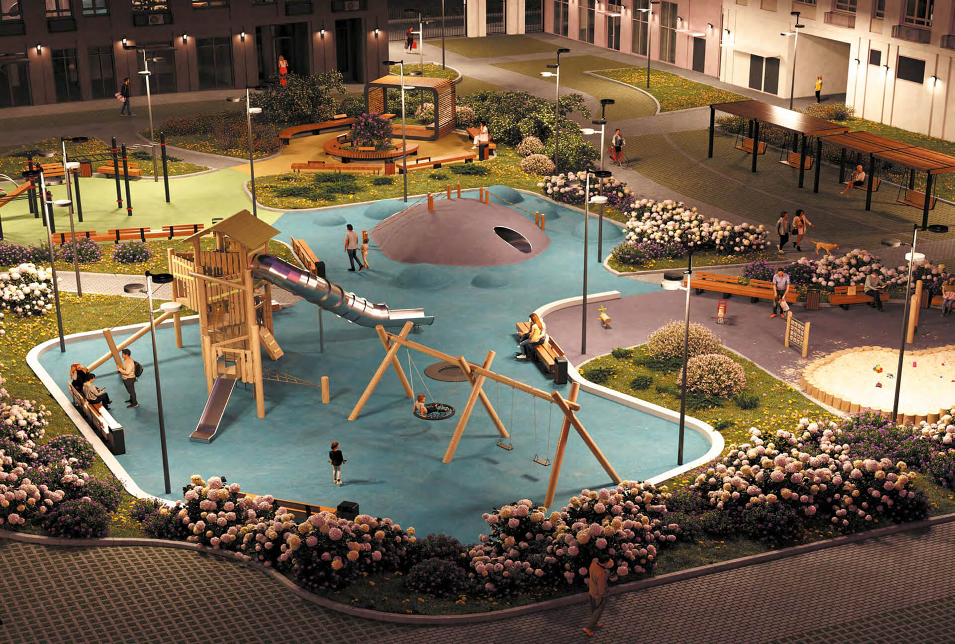 Для самых маленьких предусмотрена специализированная игровая площадка с мягким покрытием, песочницей и качелями. Детям постарше понравится многофункциональный игровой комплекс, а взрослые оценят современный воркаут и зоны отдыха с дизайнерской мебелью. Пространство организовано так, чтобы каждый нашёл место по интересам: будь то утренние тренировки, семейные прогулки или вечернее общение в беседке.
